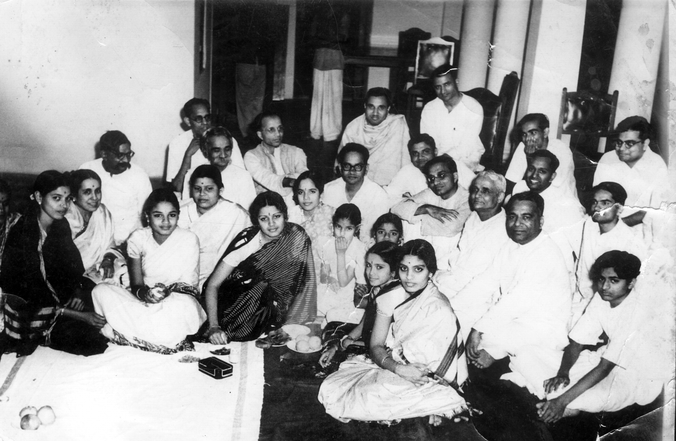 அமர்ந்திருப்போர் பம்பாய் சிவராமகிருஷ்ண ஐயர், ரசிகமணி டி.கே.சி., எம்.எஸ்.சுப்புலக்ஷ்மி, ராதா, கோவை சுப்ரி. நடுவரிசையில் மத்தியில் சதாசிவம் மற்றும் பலர்.